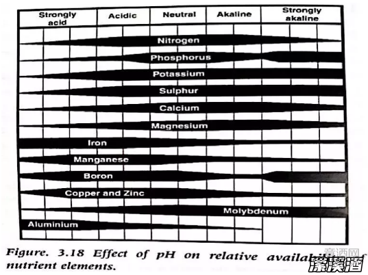 从此表可以看出,大多数植物生长所需要的营养元素的可吸收度集中在中性pH的范围内。过低的pH,土壤会“释放”出铝和锰,导致土壤产生“毒性”,不利于植物生长。土壤中的主要阳离子是钙、钾、镁和纳离子。土壤的阳离子交换能力越强,土壤中营养保留潜力约强,并且对植物根系生长所需求的营养元素的供给能力也越好。