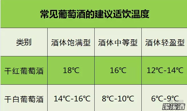 轻盈型:这类葡萄酒的酸度一般较高,温度过高会凸显酸度,影响口感,所以建议适饮温度为 6℃-9℃。