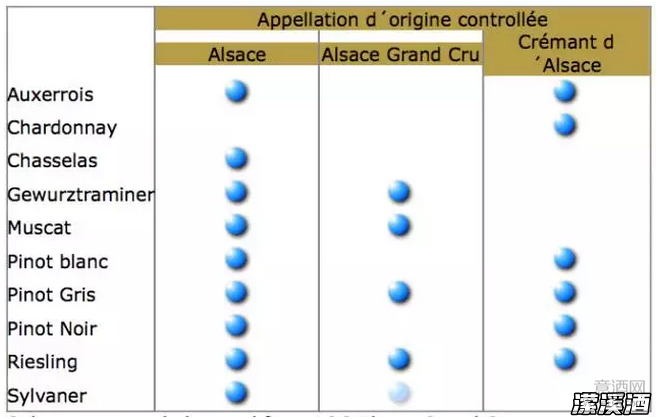 阿尔萨斯三种原产地命名制度和葡萄品种对应图。