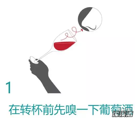 第一次闻:旨在了解葡萄酒香气的强度和挥发性最强的芳香;无需转杯,慢慢将酒杯提上至鼻前并尽量不摇晃杯中葡萄酒。初始映像会传达出酒香的密度和质量并透露出它最具有挥发性的成分。