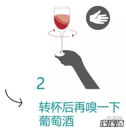 第二次闻:转动酒杯让葡萄酒充分接触空气,然后再次嗅其气味。这一动作让在第一步中就已察觉的香味更加集中,并让葡萄酒释放出它较不易挥发的成分。