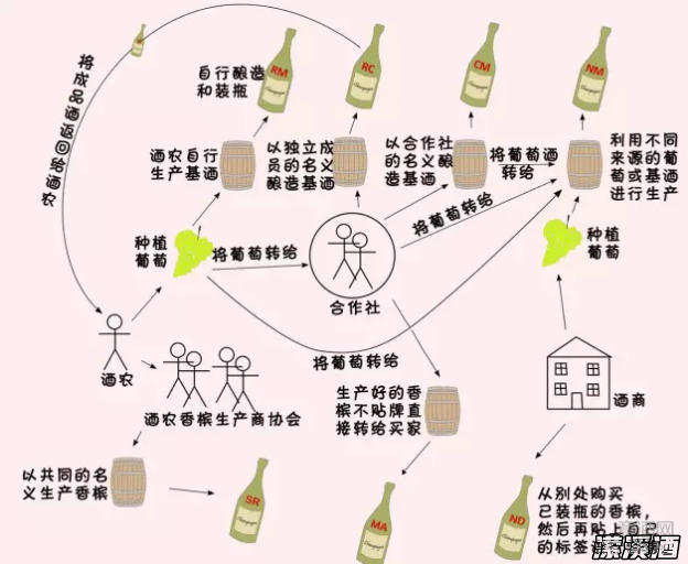 R 代表的 Recoltant 是葡萄种植者的意思,指的是合作社中的一个独立成员,即酒农;C 代表的 Cooperative 是合作社,意指由合作社酿造葡萄酒。香槟酿好后,酒农会以自己的独立品牌来自行销售香槟,这一点和酿酒合作社大相径庭。也就是说,大体上除了生产酿制过程,葡萄种植和葡萄酒销售都由酒农自己完成。