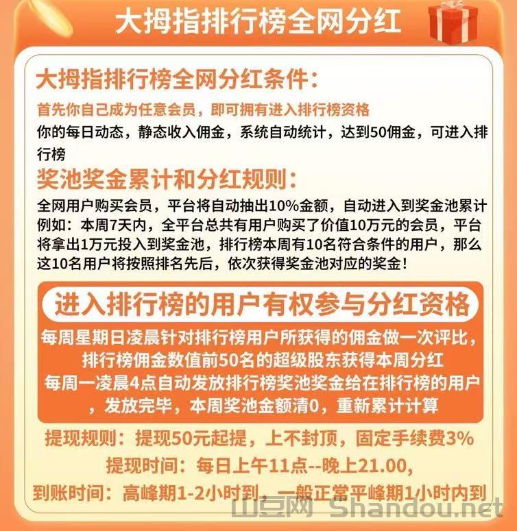 推广体系 • 直推奖励:邀请好友每日收益的100%提成(如好友日赚1元,上级同步获得1元) • 间推奖励:二级用户收益的20%提成• 团队奖励:最高可享受8级团队成员收益分成,包含**奖励(1-6代1%-15%提成)和**奖励(每日团队收益的2.5%)