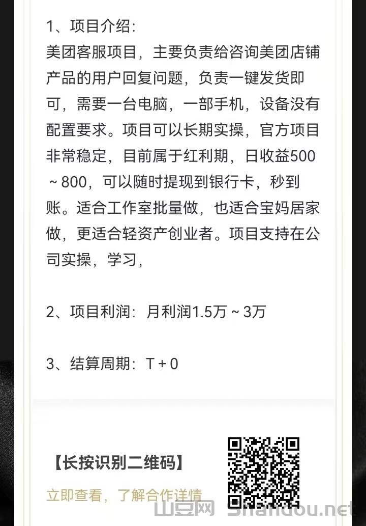 正文 美团客服项目,月收益2W+,长久稳定,工作室可批量复制 秒到网 V管理员 /01-04/6阅读/0评论 0104 1、项目介绍:美团客服项目,主要负责给咨询美团店铺产品的用户回复问题,负责一键发货即可,需要一台电脑,一部手机,设备没有配置要求。项目可以长期实操,官方项目非常稳定,目前属于红利期,日收益500~800,可以随时提现到银行卡,秒到账。适合工作室批量做,也适合宝妈居家做,更适合轻资产创业者。项目支持在公司实操,学习,2、项目利润:月利润1.5万~3万3、结算周期:T+0【长按识别二维码]立即查看,了解合作详情