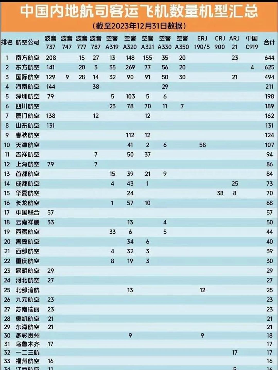 山航(SC)、春秋航空(9C)、上航(FM)等航空公司也位列前十名,但具体排名和数量未详细列出。