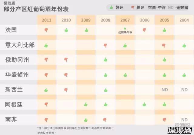 以下这份简单的表格,主要涵盖了意大利北部、法国、俄勒冈州、华盛顿州、南非、新西兰以及阿根廷等产区,在2004~2011这个时间段内的年份差异: