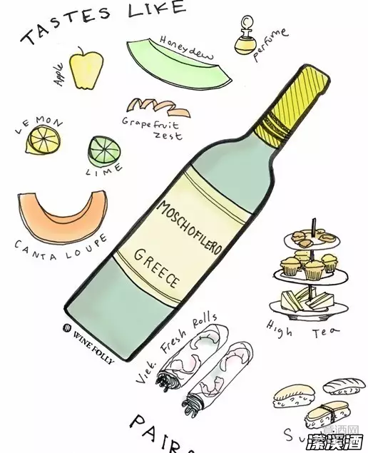 Moschofilero:起源于希腊的一个白葡萄品种,酿造的葡萄酒具有玫瑰花和辛香料的味道,酸度也不错。这个葡萄的品种特性和麝香很相似。