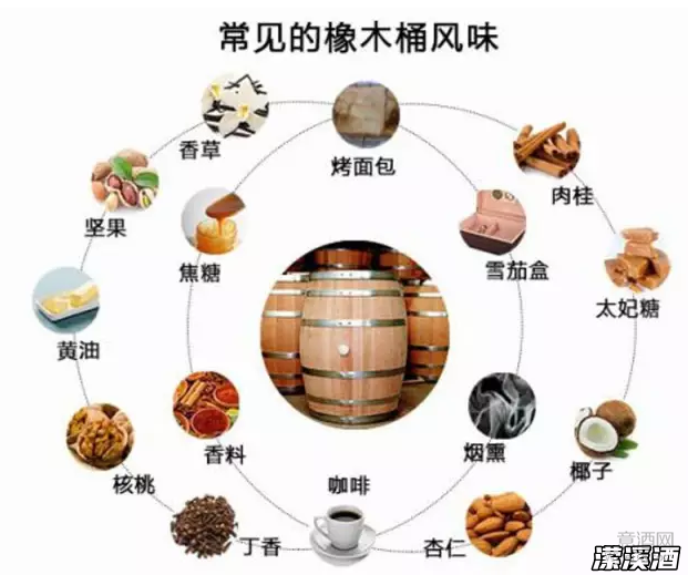 葡萄酒与橡木桶接触后,橡木中的风味物质也会浸入酒中,其中包括橡木单宁和香气物质。