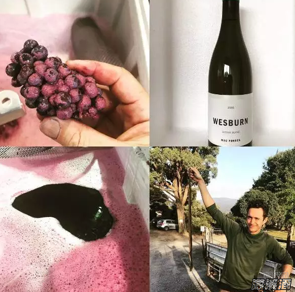 Mac Forbes酒庄里正在发酵的整串黑比诺(左上)和酒庄酿造的白诗南(右上)