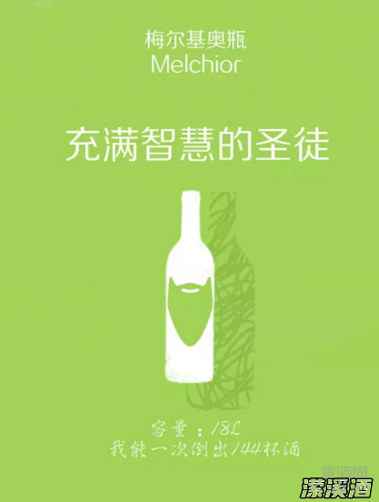 我是波尔多最大的葡萄酒瓶。在香槟产区,我叫做所罗门瓶(Salomon)。我的名字来自梅尔基奥,他是波斯(Persia)国王,同时也是《圣经》中另一名朝拜男婴耶稣的圣人。