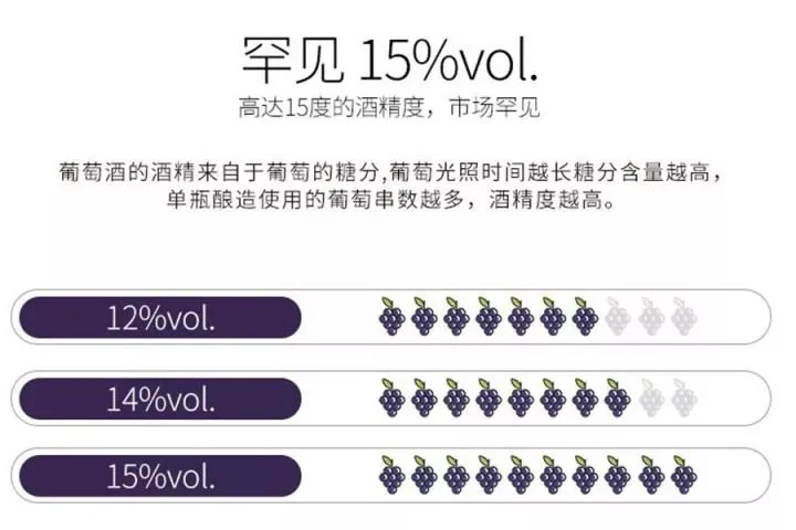 锲而不舍的我继续搜 15% 葡萄酒,结果如出一辙,商家同样以高酒精度为卖点,并声称单瓶使用的葡萄串数越多,酒精度越高。