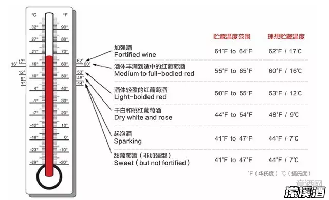 酒体较轻盈的梅洛和黑皮诺等红葡萄酒的最佳贮藏温度是12℃左右;酒体较丰满的红葡萄酒(如赤霞珠和西拉)最理想的贮藏温度则是16℃。酒体较轻盈的干白和桃红葡萄酒最好存放在温度在9℃左右的地方;酒体较丰满的白葡萄酒贮藏温度可稍高。起泡酒和甜型非加强型葡萄酒最理想的贮藏温度则是7℃;波特等加强型葡萄酒最佳的贮藏温度是17℃。