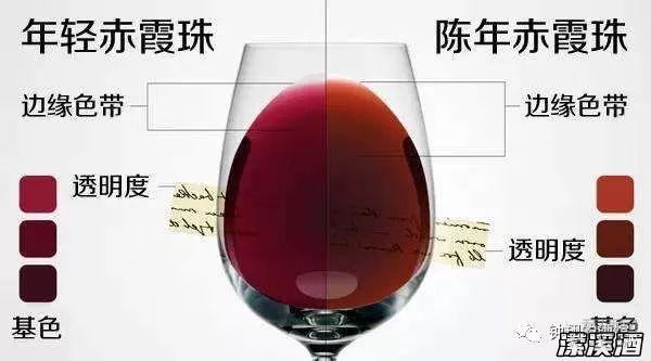 不稳定的色素单宁抱团沉淀,稳定的色素单宁牵手留下,红葡萄酒从原来的浓郁浑浊,变得清澈透亮,紫色调减少,黄色调增多;相反地,白葡萄酒经橡木桶陈酿后则颜色变深,类黄酮色素氧化着色,从偏青色调转为偏金黄色。